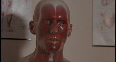 I first learned of the 1988 film Pin… while reading one of Final Girl’s Friday poster posts. Still, even then, all I knew of it was its title, “Pin…”, and the image on the poster of an ascending staircase with a small figure in a wheelchair sitting up top. I loved the (dot) (dot) (dot)s in the title, but it was that wheelchair that sold me. So I clicked PLAY the other day, and was instantly host to one of the most twisted movies I’ve seen in awhile.In order to make a long explanation of that above declaration short, and to get to the ending that this post is intended to be about, let me attempt a X16 fast forwarded version of the plot: rich kids… father is a pediatrician… pediatrician uses anatomically-correct anatomy dummy like a ventriloquist … the dummy’s name is Pin (short for Pinocchio)… pediatrician’s son believes Pin is real… pediatrician’s son sees nurse have sex with Pin… the pediatrician has Pin teach his kids the birds & the bees and then shows them Pin’s penis… incest fantasies … father giving daughter an abortion…. AND MORE!
