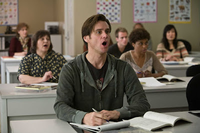 The time is right for a movie like Yes Man. The more connected and media obsessed we've become, the more disconnected and dispossessed of social contact we've ended up. Twitter, MySpace, Facebook; laptops, iPhones, Direct TV. All of these things have their benefits, but the unintended consequence is a culture full of head-down shufflers and shut-in mumblers. "I'll just buy it on Amazon" ... "I'll let that one go to voice mail" ... "I'm gonna wait until it's On Demand". Even the undervalued experience of browsing inside a record store is slipping away. The tactile pleasure in holding an anticipated New Release, eye contact with fellow customers, the sound of cross-chatter. Yes, technological progress is great, and convenience is a virtue rarely frowned upon, but soon enough we may miss those awkward run-ins at the bookstore.Carl Allen (Jim Carrey) is a man who's worked hard in the first third of his life in order to reach that peaceful plateau where he can disappear. Graduate, get a college degree, settle in with a company, work your way to that high five-figure salary bracket, then ride that wave until the end of your life. On paper that's not a bad plan, but is it human? Similar in moral to Along Came Polly and this year's barely seen Chaos Theory, Yes Man proclaims "no", and that a life lived through the weighing of options is a life wasted. Accept everything, refuse nothing... even if it's a denture-free blowjob from your neighbor granny. (Yes, awkwardly, that really happens in Yes Man.)