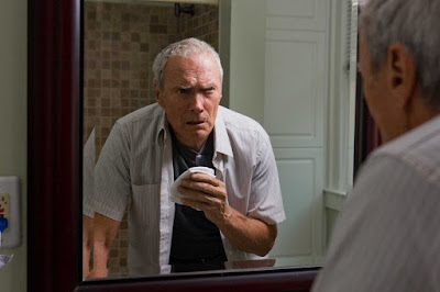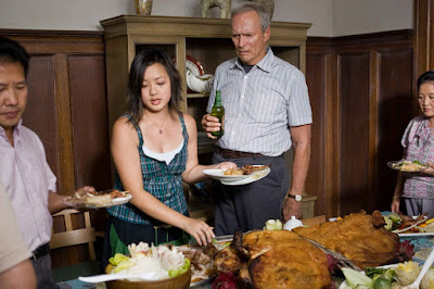 Not three minutes into Gran Torino and Walt Kowalski's (Clint Eastwood) squinty-eyed, mumbling growl ("mmmgrrrrr") is already walking itself towards the door of infamous movie verbalizations, grabbing a chair at the table of Al Pacino's "whoo-wa!" in Scent of a Woman, and Billy Bob Thorton's "mmm-hmm" in Sling Blade. Luckily, that cartoonish mannerism fades away, but because Eastwood is not a subtle director (remember that glow in the dark cross that dangled from the priest's neck at the beginning of Mystic River?... oy) he continues to beat the audience over the head with the many flaws/traits of Walt: racial slurs, "these kids today" jibes, tobacco spitting, rifle toting. It's enough already after thirty minutes.But then Gran Torino gets good. Walt's relationship with his Hmong neighbors, and his place in the transformed Hmong community of old Detroit, opens up honest moments of modern cross-generational racial anxiety. Instead of the Hmong brother and sister joining together to help Walt grow a golden heart of rainbow tolerance, Eastwood shows the emotional depth and complexity that can exist under the skin of someone who wears a face of bigotry. Even as tempers cool and the Lor family accepts Walt into their home, the old man doesn't refrain from his stereotype-driven humor. While grilling, Walt asks, "How do you take your dog?". Without missing a beat, Sue fires back, "I've told you, we eat cats!".